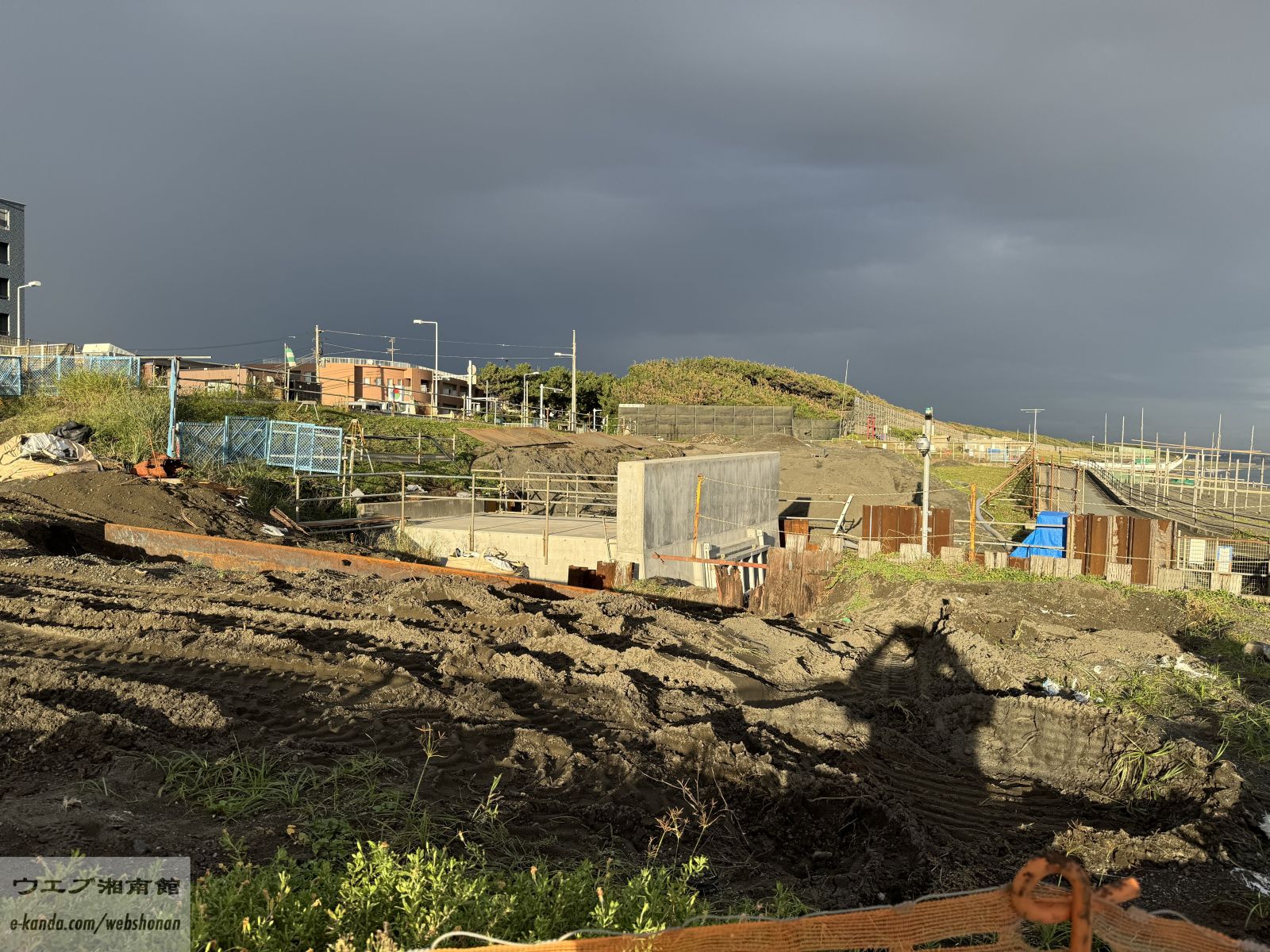 プール跡の工事現場手前からサザンビーチ方面を眺める。