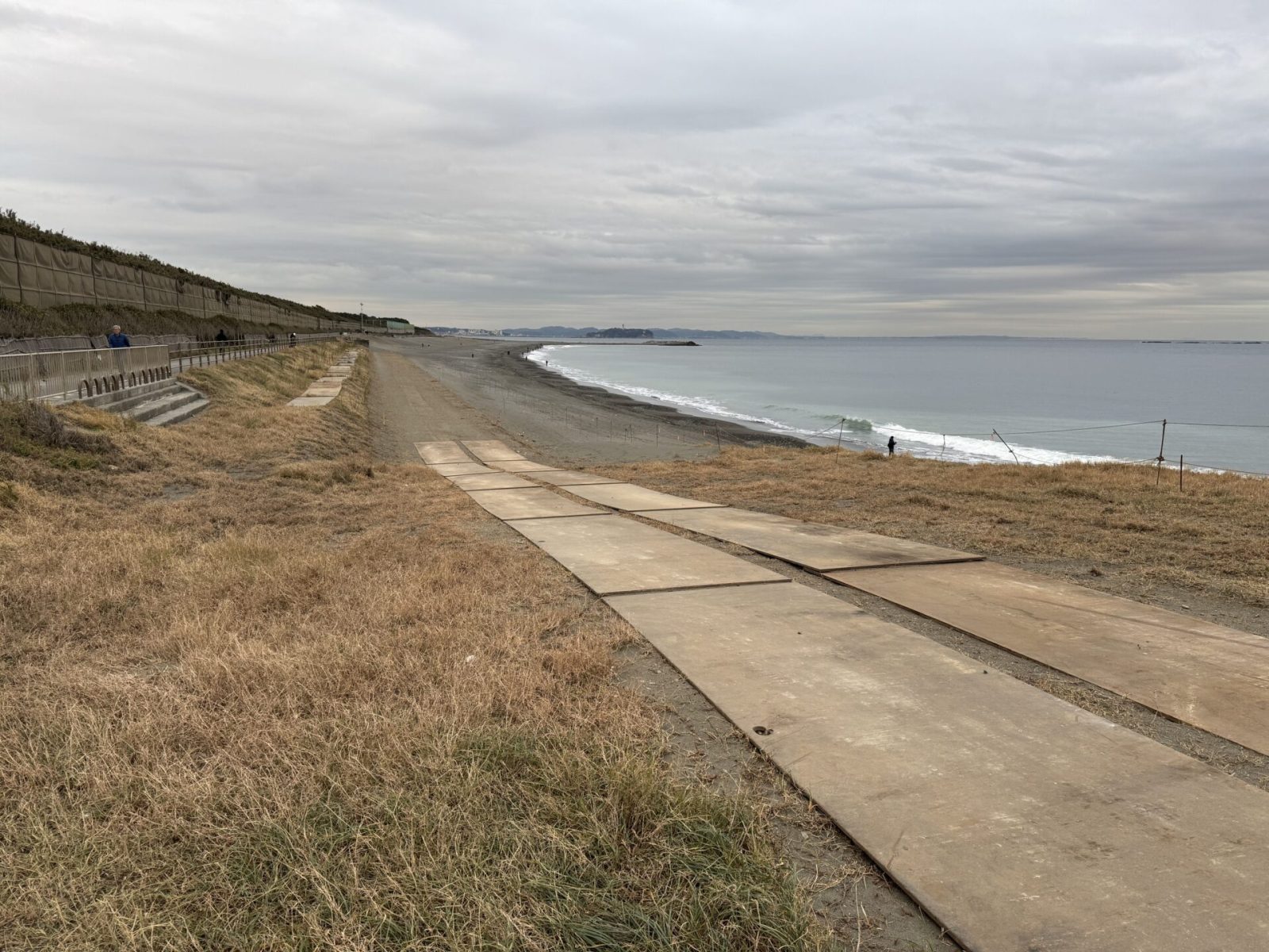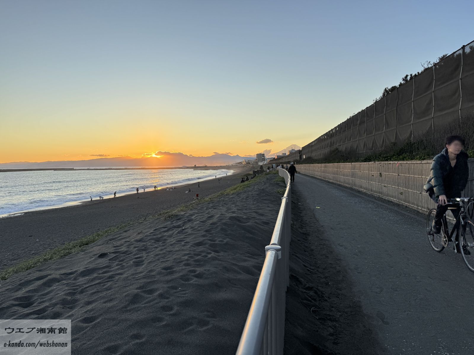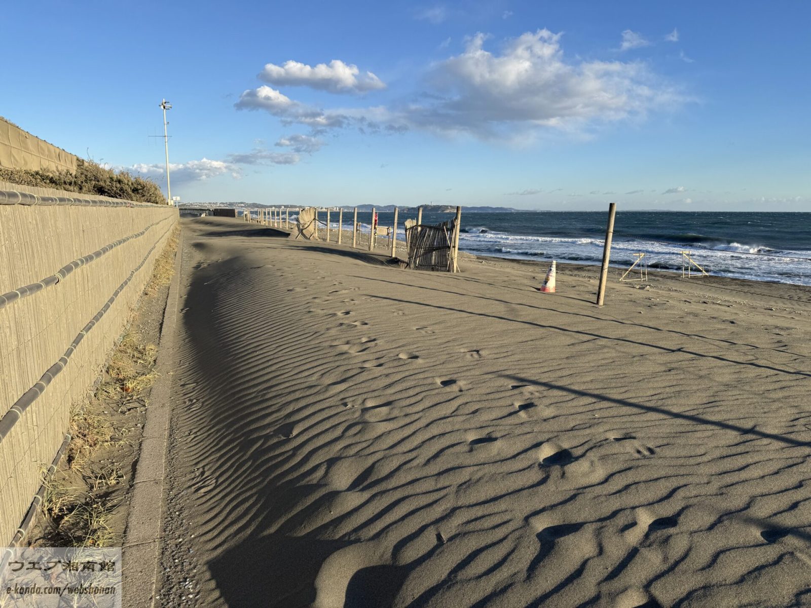 同じ海岸を少し広いアングルで。どこまでも続く広い砂浜と、それを受け入れる大きな空。この開放感こそが湘南の魅力です。冬は空気が澄んでいるため、遠くの景色までくっきりと見渡せ、心の視界まで開けていくような爽快感があります。