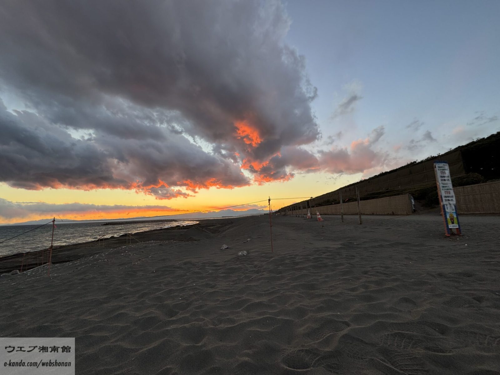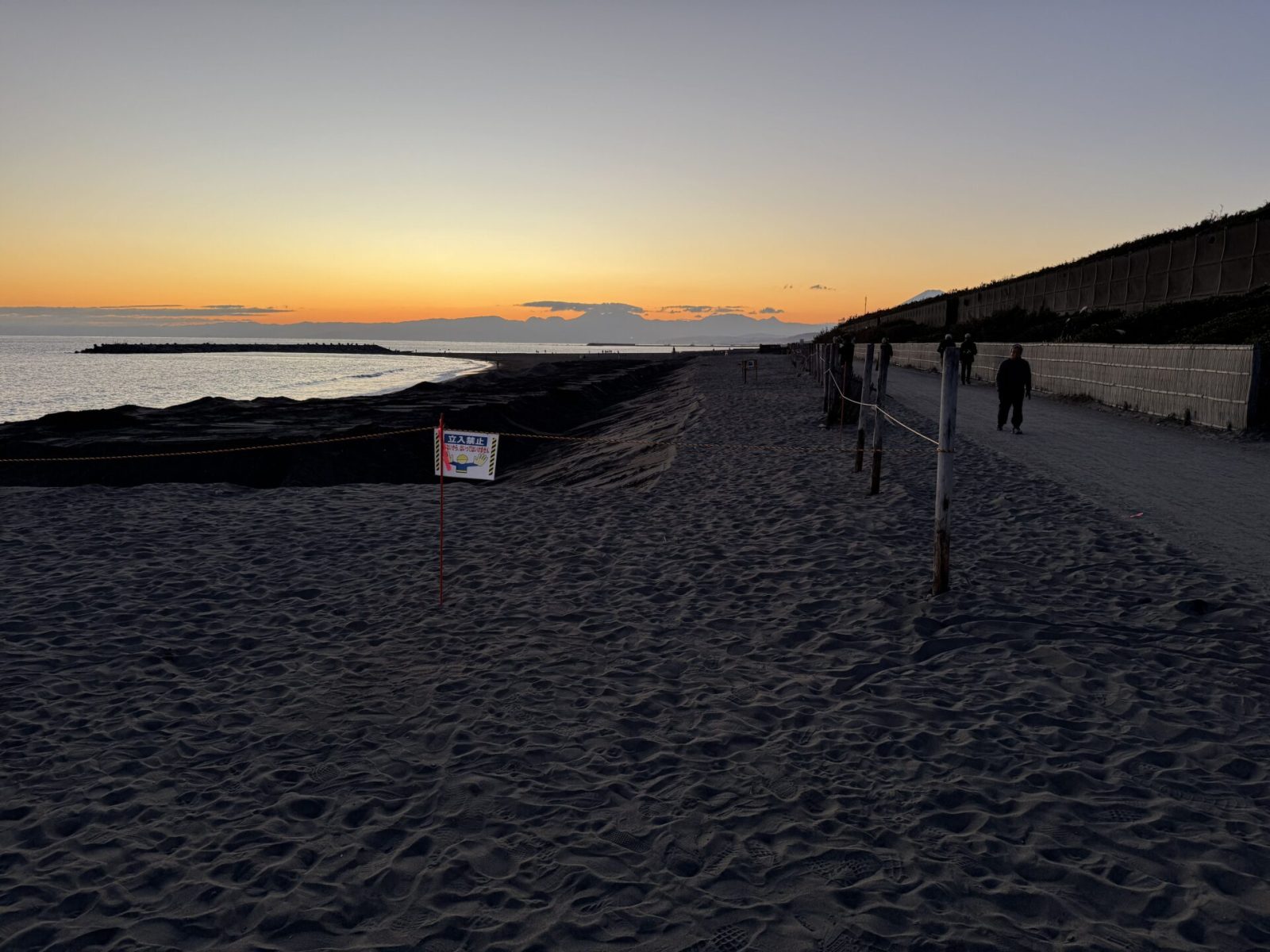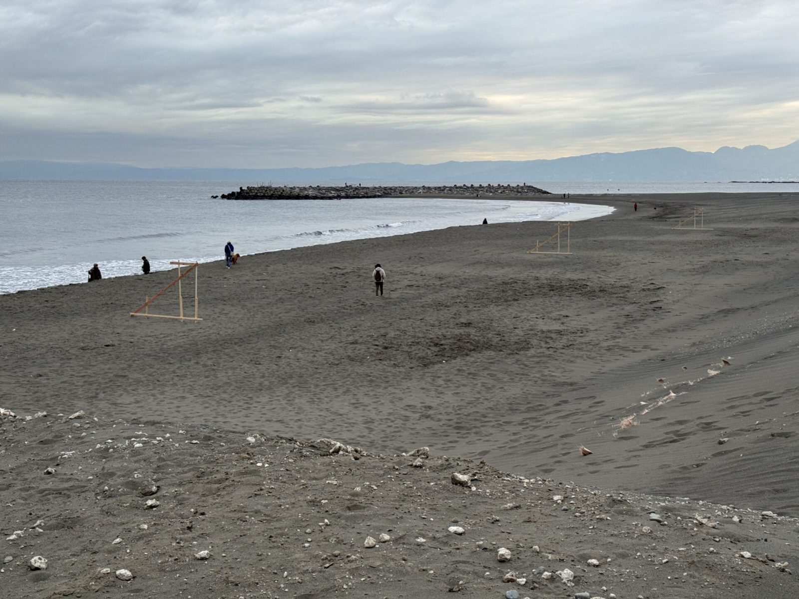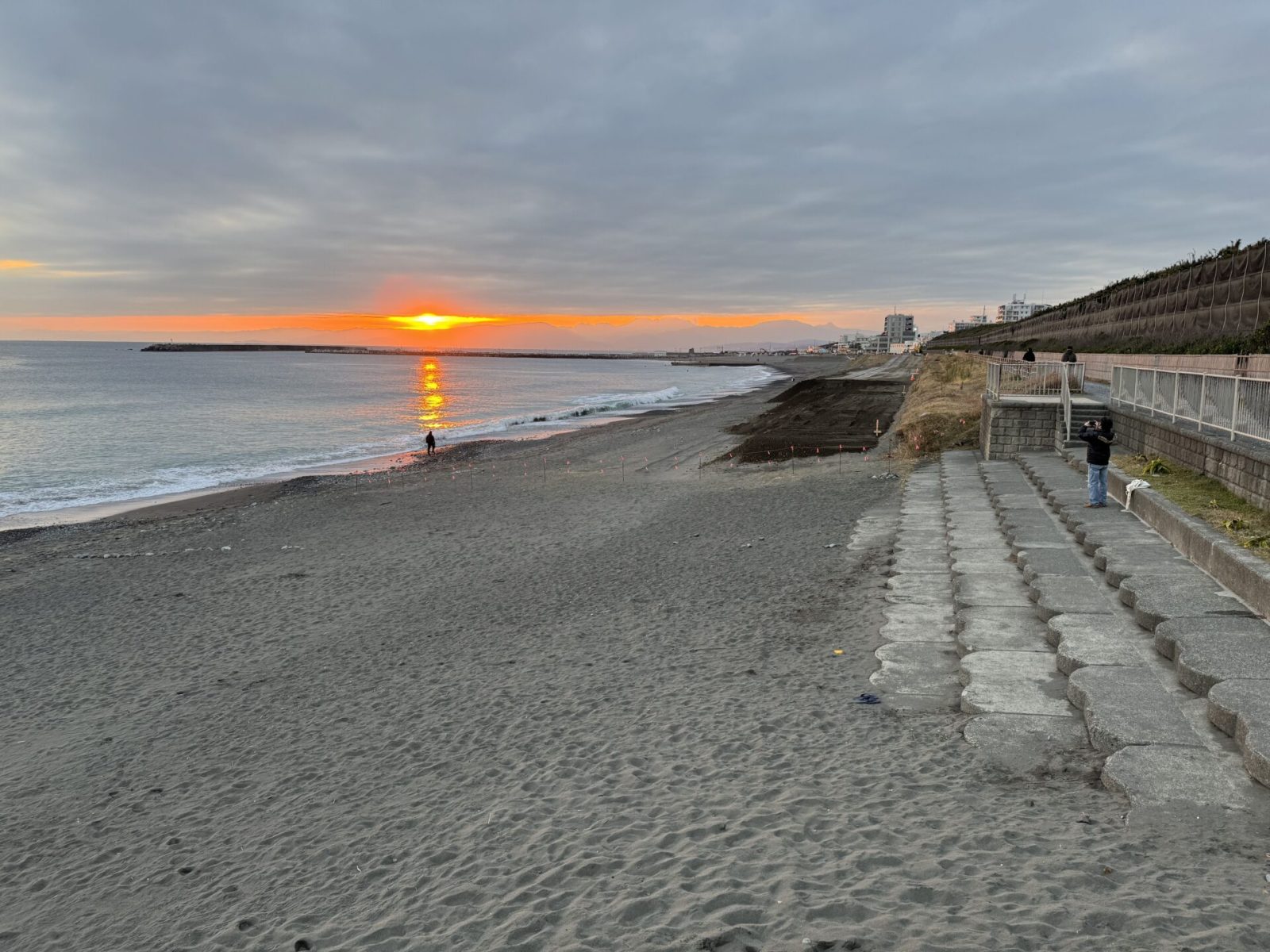 同じ海岸を少し広いアングルで。どこまでも続く広い砂浜と、それを受け入れる大きな空。この開放感こそが湘南の魅力です。冬は空気が澄んでいるため、遠くの景色までくっきりと見渡せ、心の視界まで開けていくような爽快感があります。