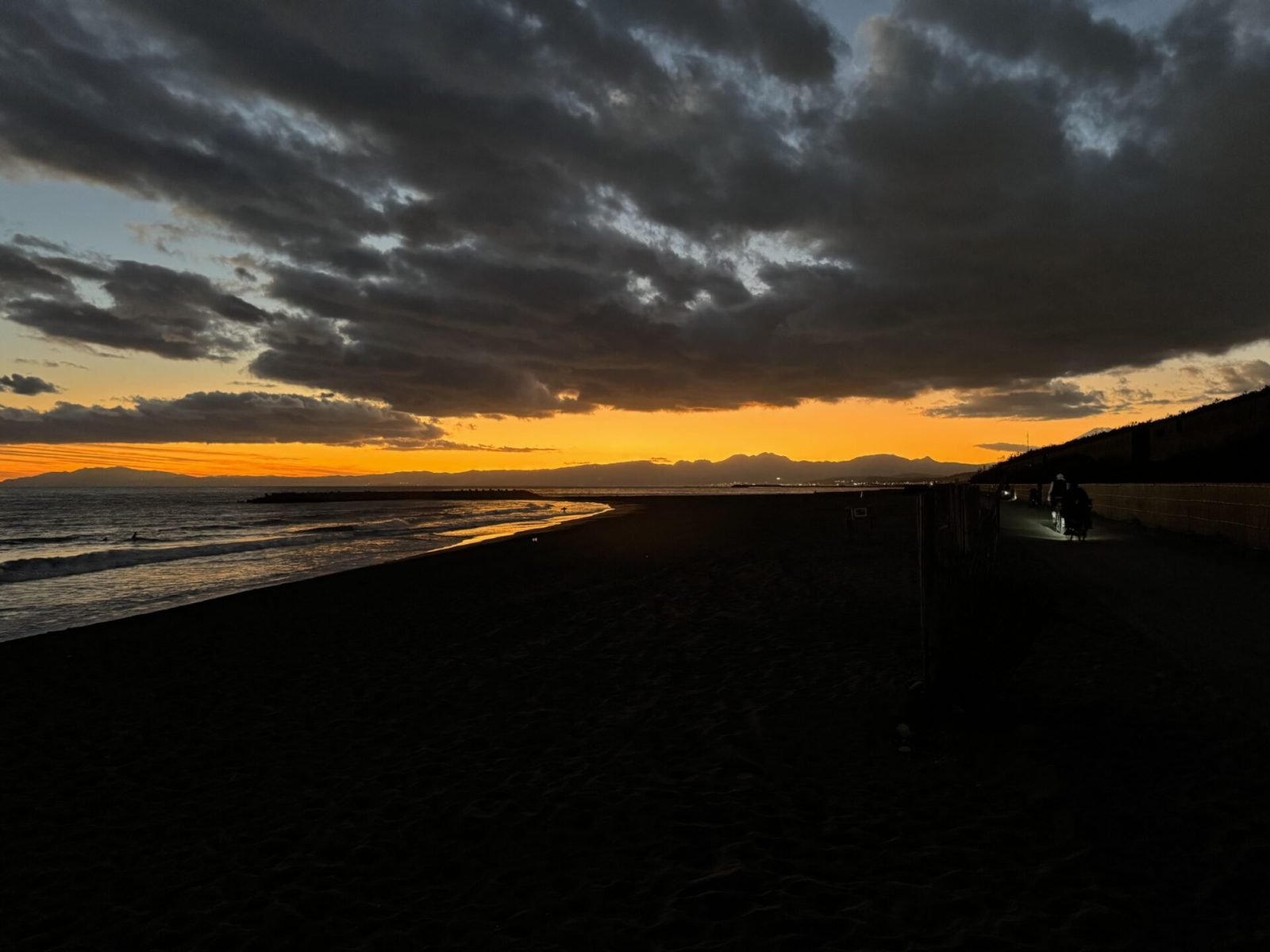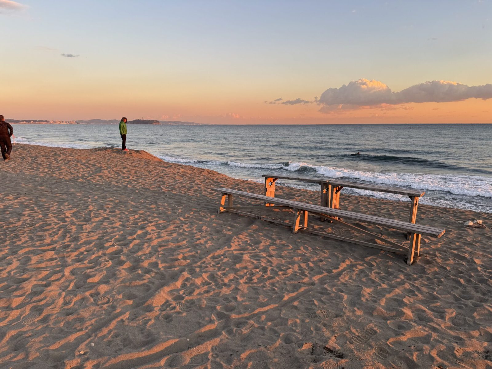 砂浜に座り込んでこの光景を眺めていると、時間が止まったかのような錯覚に陥ります。遠くで波と戯れる人々のシルエットが、広大な海を背景に小さく浮かび上がり、自然の大きさと、そこに流れる穏やかな日常の尊さを教えてくれます。
