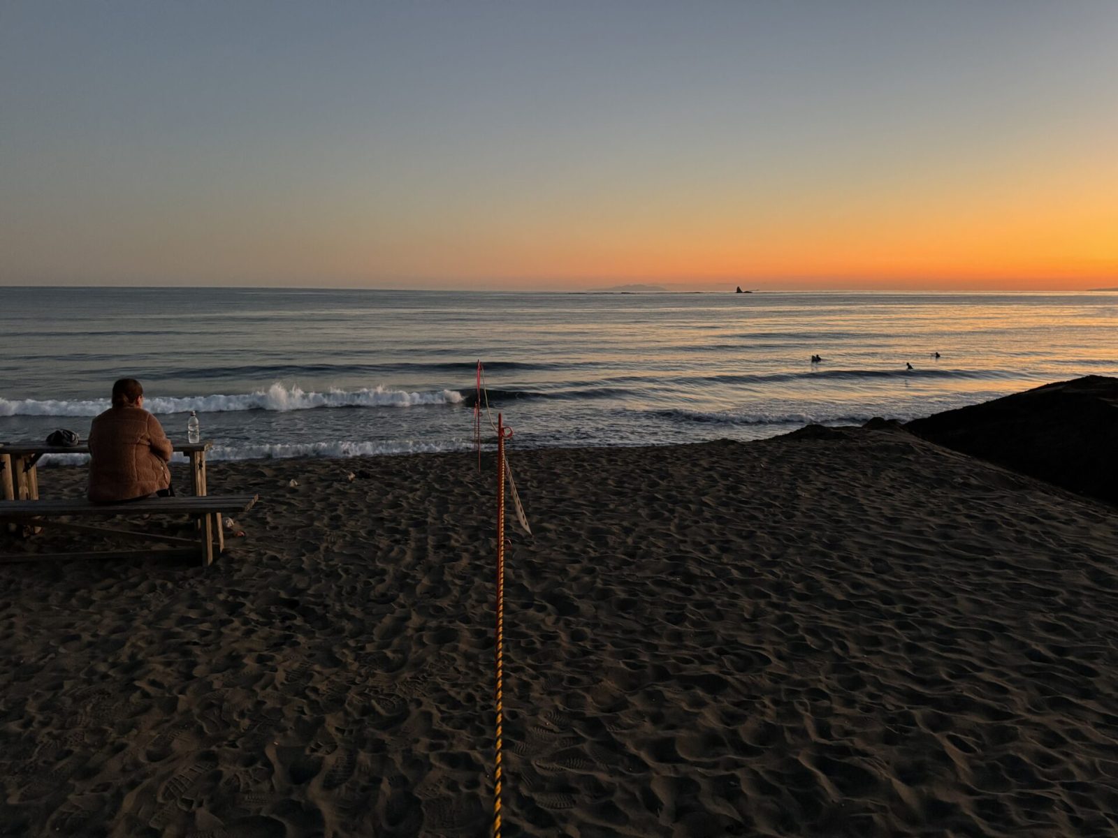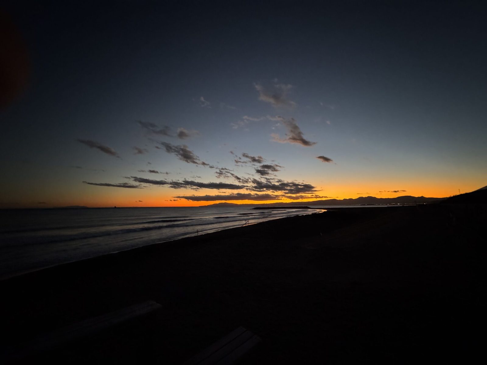 波の音だけが響く静寂な時間。遠くの水平線がじんわりと赤く色づいていく様子は、何度見ても飽きることがありません。