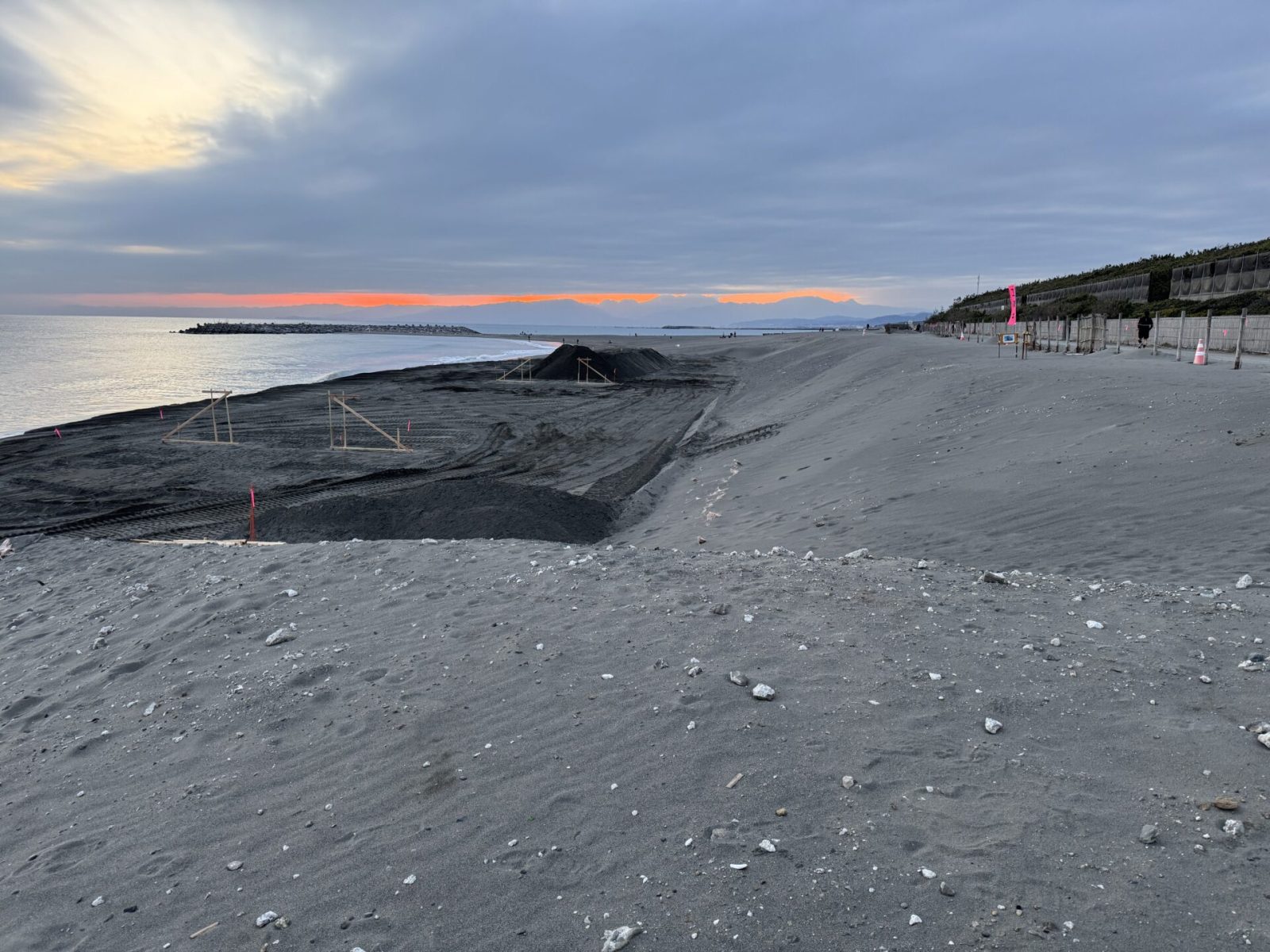 サイクリングロードが曲がりくねっていた箇所をほぼ直線にする工事らしい。陽が沈み出す。