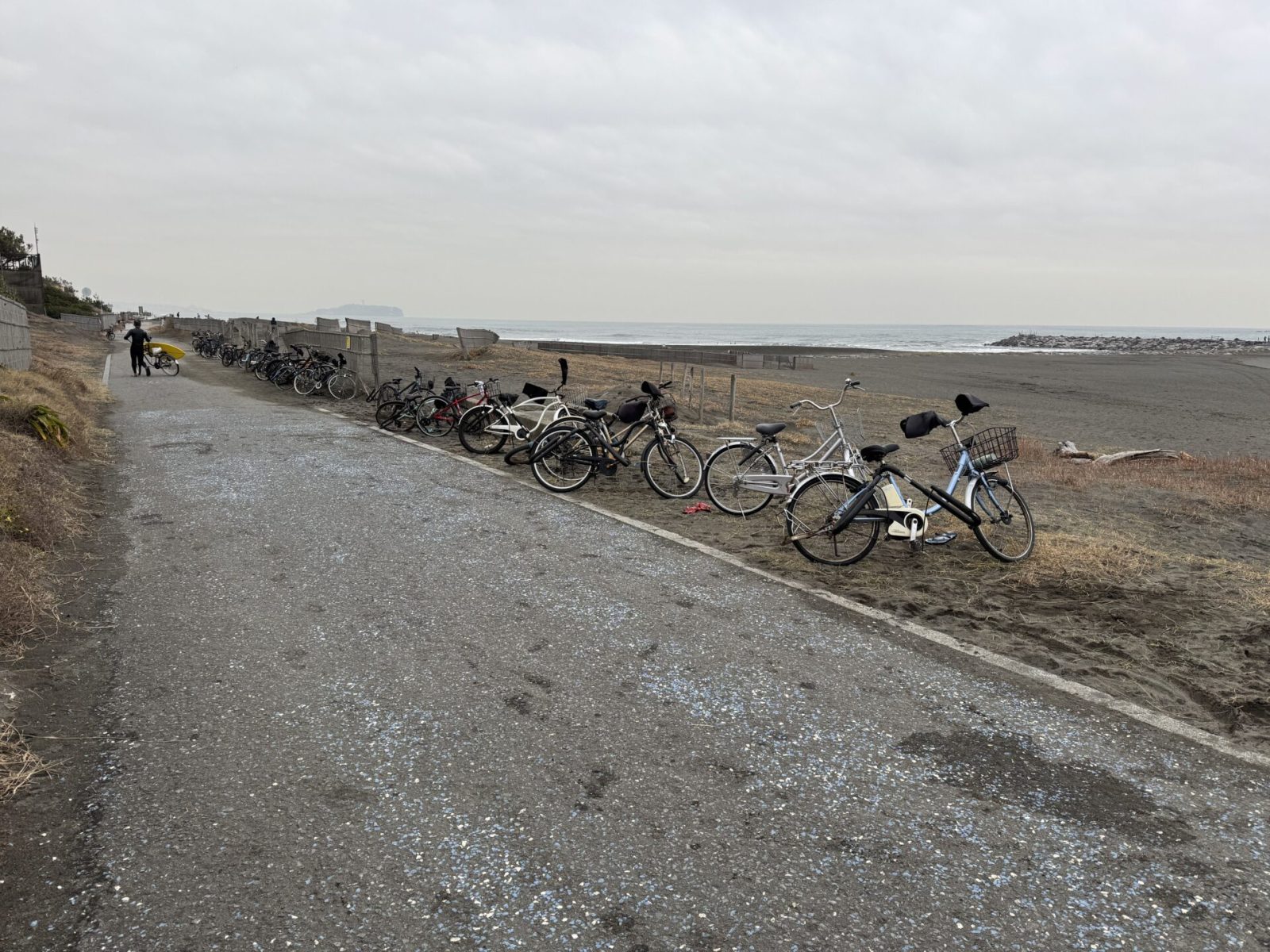 サーフィン日和なのか、サイクリングロードの一角には、サーファー達が乗り捨てた自転車が多数並ぶ。