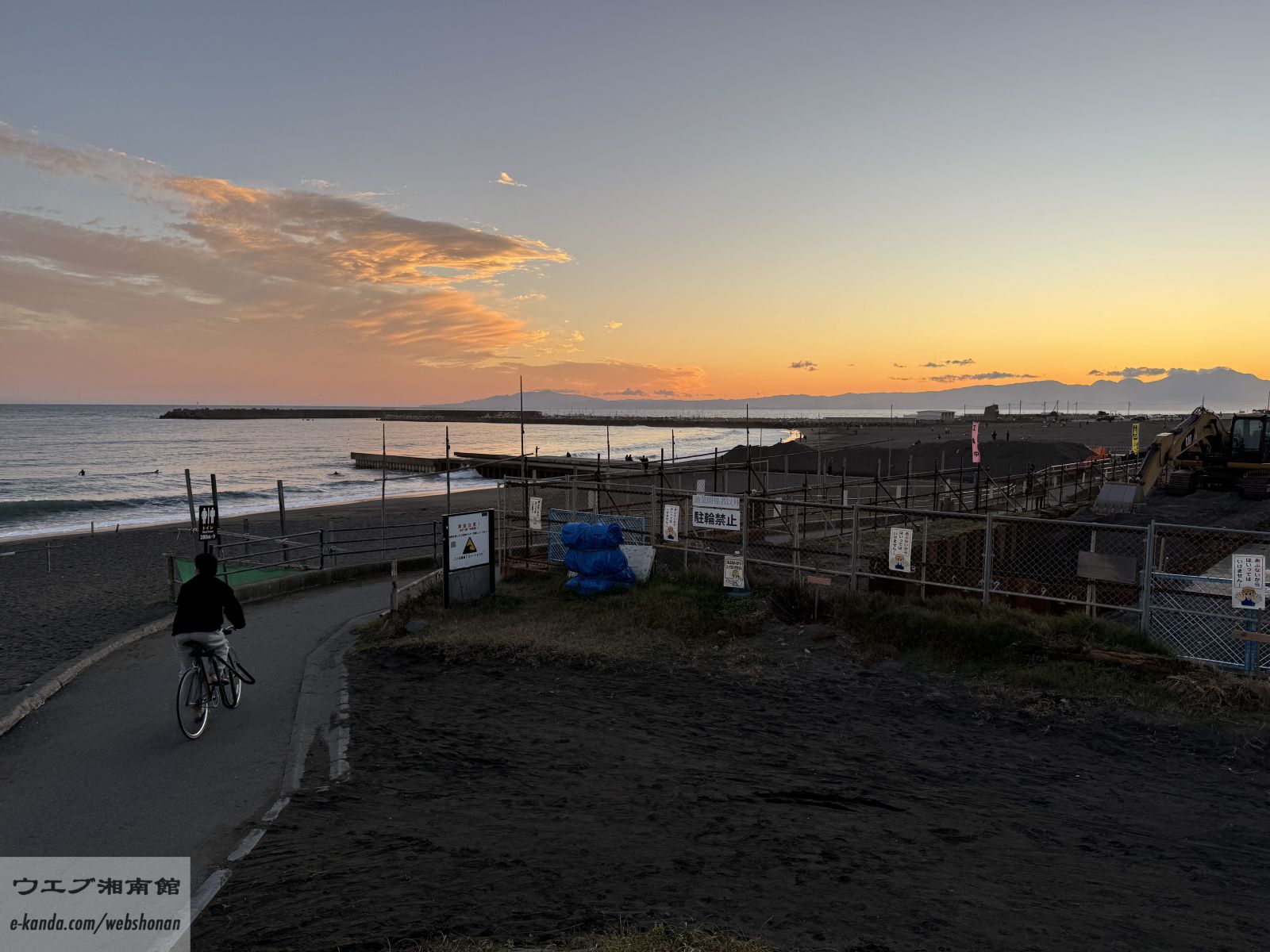 平日の夕方。陽が沈む瞬間。人の気配は少なく、波音が際立つ。湘南の海が本来のリズムを取り戻す時間。