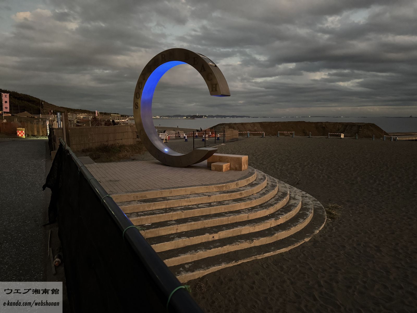 平日の夕方。陽が沈む瞬間。人の気配は少なく、波音が際立つ。湘南の海が本来のリズムを取り戻す時間。