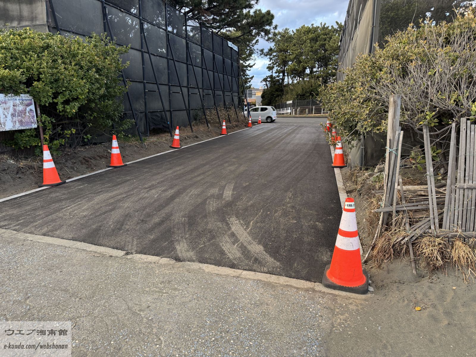 ついに真新しいアスファルトの舗装が完了した海岸への通路。季節の変わり目に、新しい道ができました。