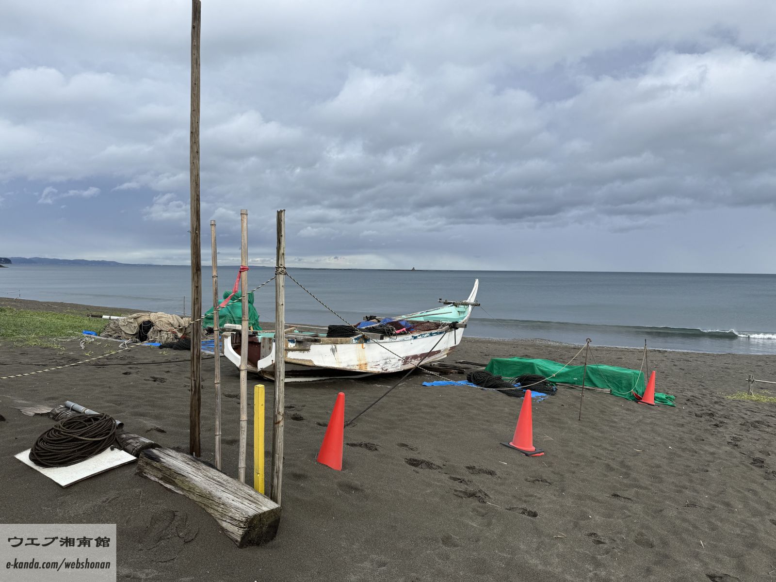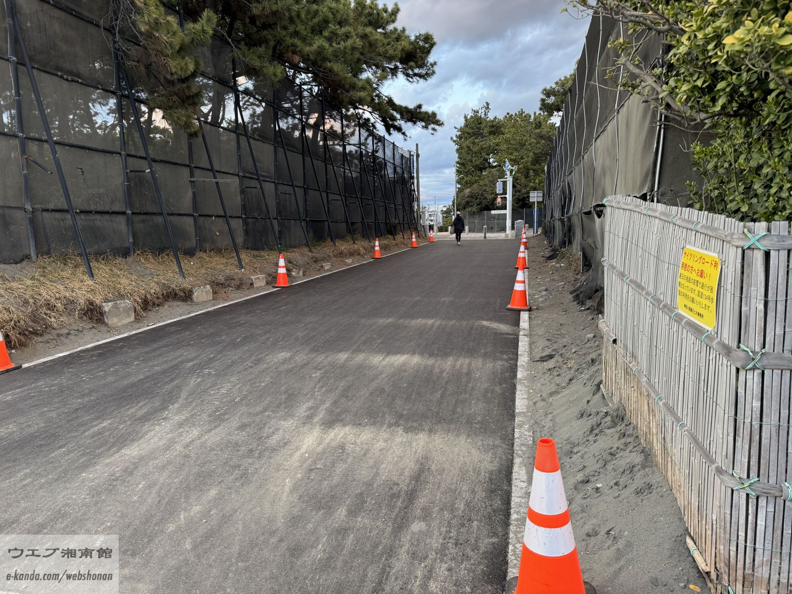 完成した遊歩道を歩く人の姿。松の緑と黒い防砂ネットが続く風景は、湘南らしさと整備の跡が共存する穏やかな一場面。