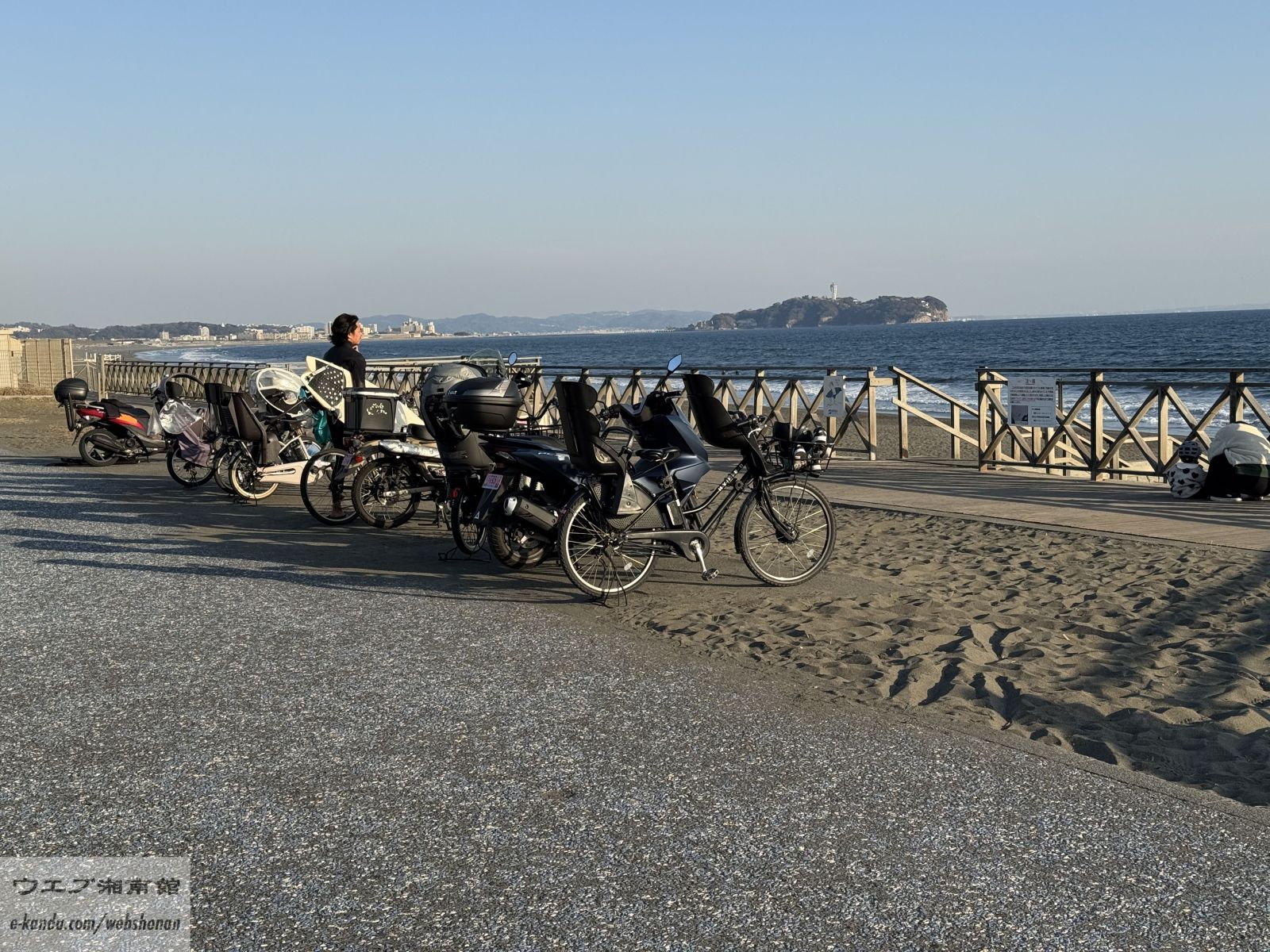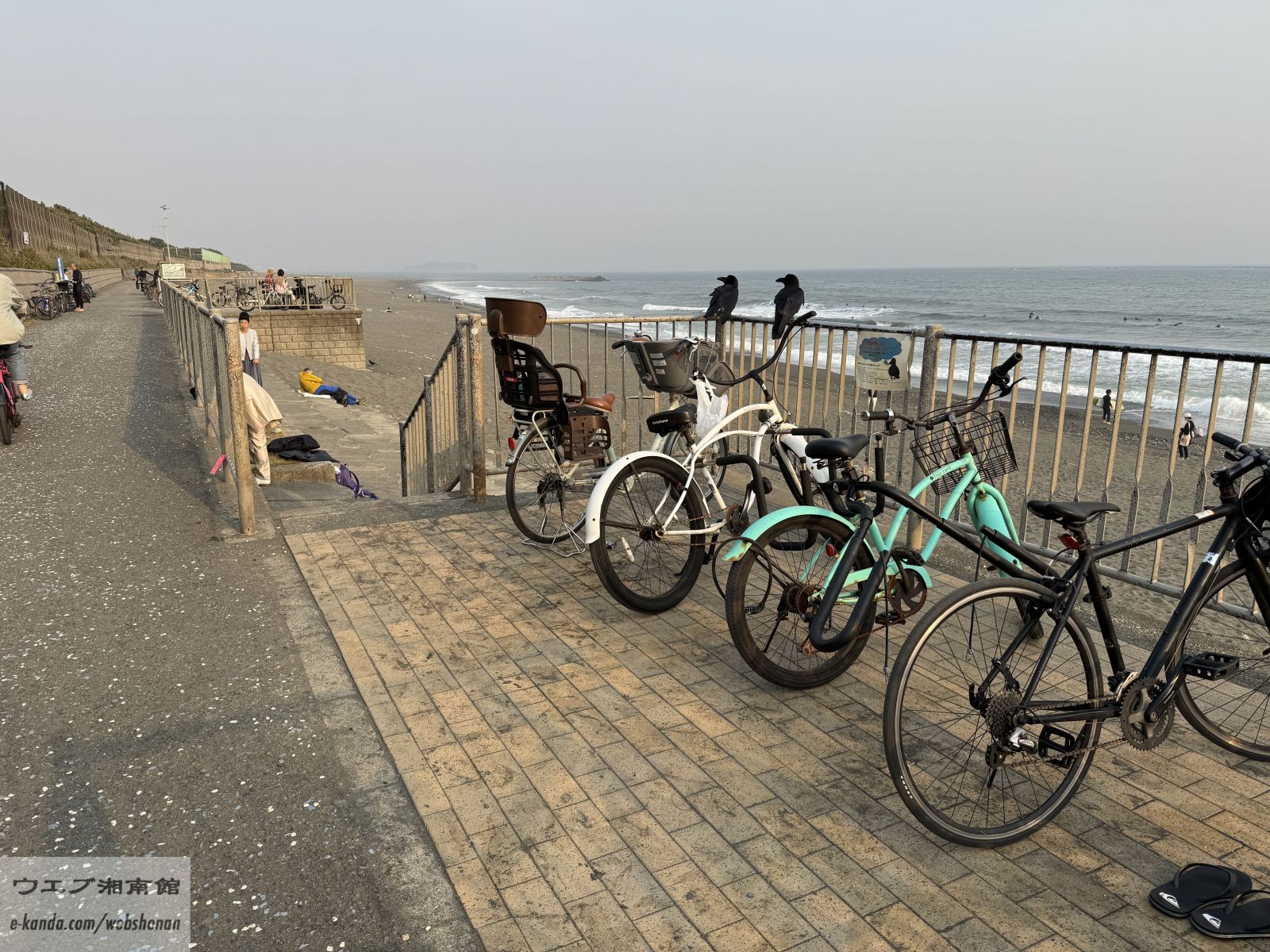 海辺のサイクリングロード。自転車が並び、柵にはカラスが一休み。春を感じる柔らかな空気が、浜辺のリズムを優しく包みこむ。