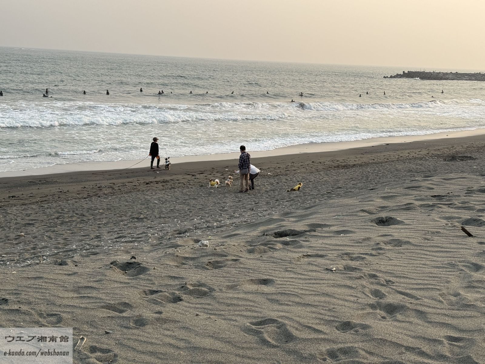 4月27日、午後4時を過ぎた湘南の海岸。この時間になると、どこからともなく愛犬を連れた人々が集まり、浜辺は一気に賑やかになります。一匹では飽き足らず、二匹同時に連れて歩く人や、リードを外して愛おしそうに抱きかかえてくる人の姿も。
