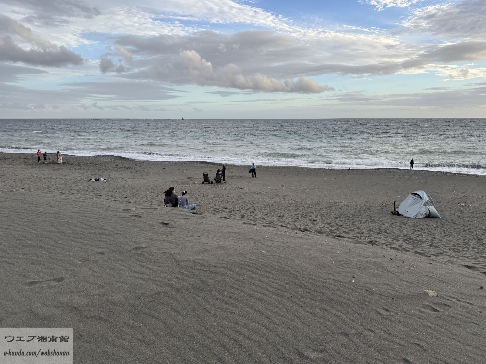 波打ち際で水遊びに興じる子もいれば、砂浜にシートを広げてピクニックを愉しむ家族連れ。あちこちでグループ同士のたわいない雑談に花が咲く、穏やかな午後の風景ですな。