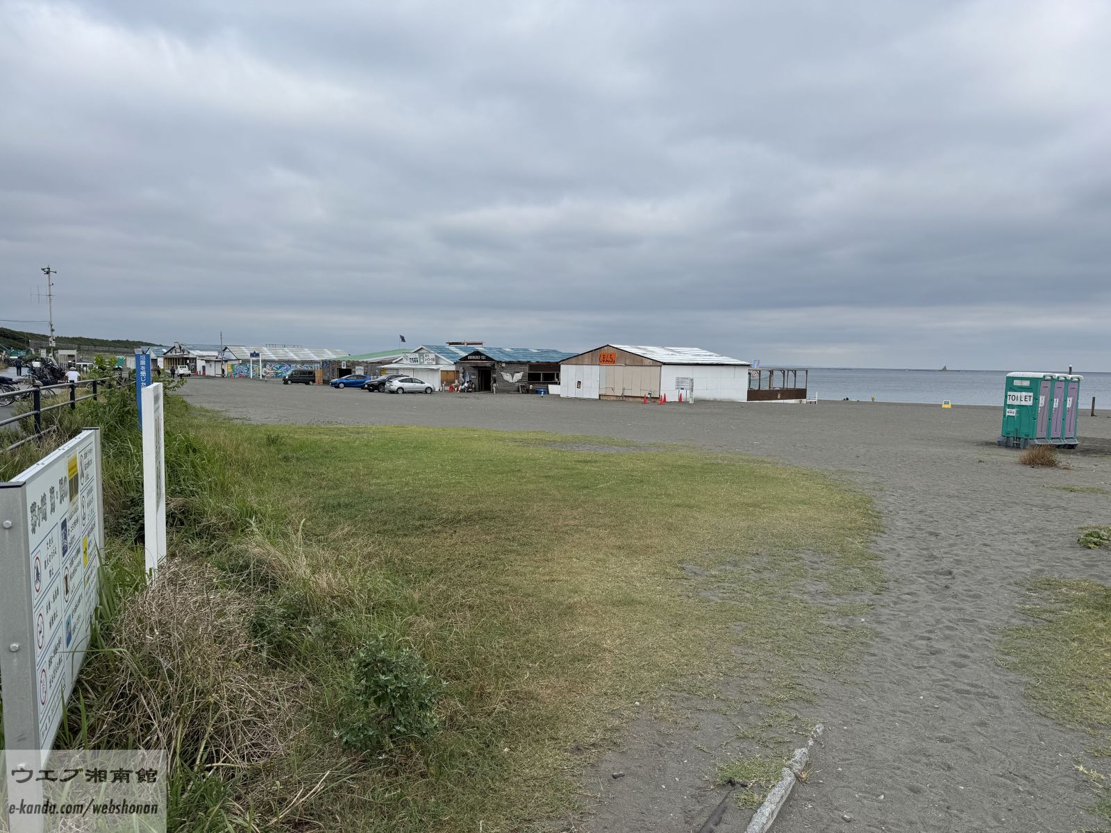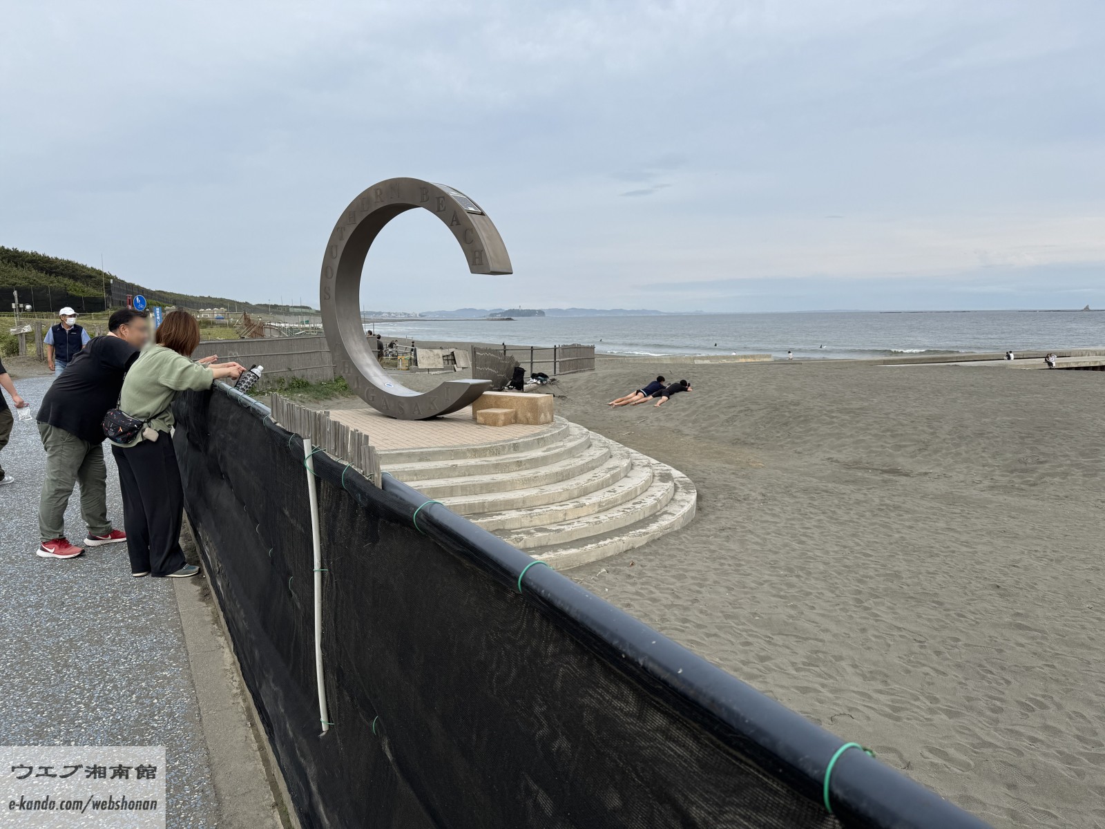 海岸線ではまた新たな整備が進行中。遠くに江の島が霞み、浜辺には自転車と重機。人々の生活と季節の移ろいが交差する場面です。