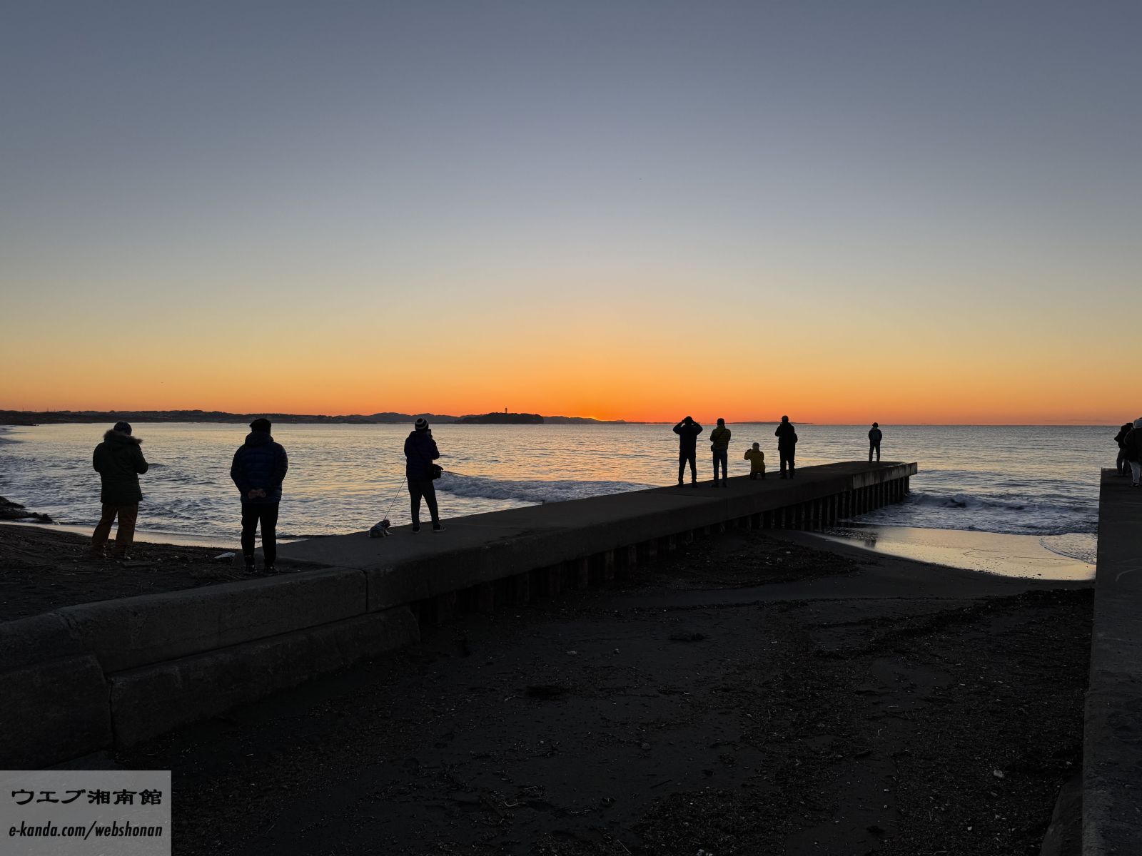 日没間近の湘南海岸。太陽はすでに低く、水平線近くが橙色に滲む。冬の空気は澄み、遠くの海と空の境目がくっきりと浮かび上がる。足早に帰る人影も、どこか静か。